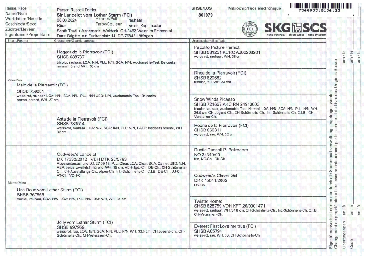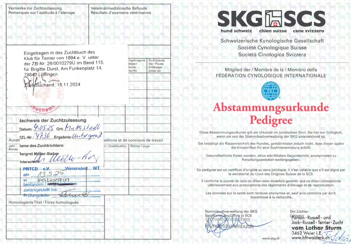 Lange haben wir gesucht und in der Schweiz im Jahr 2024 bei Trudi Schär im Kennel Vom Lothar Sturm gefunden, einen Nachfahren unseres Parson Russell, Cudweed’s Lancelot.