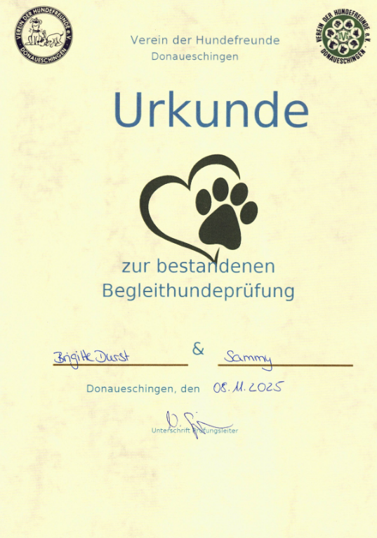 Am 08.11.2025 ging es um 7.30 h in Donaueschingen los, alles lag im Morgenfrost (-1 Grad) und leicht neblig…Als 2. Paarung waren Sammy und ich dran, ganz brav absolvierte er seinen Parcour, blieb trotz der Temperaturen liegen, als unser Gegengespann am laufen war, war ganz im Gehorsam und mit uns alle 4 Anwärter bestanden. Anschließend wurde das Ereignis noch gebührend gefeiert!