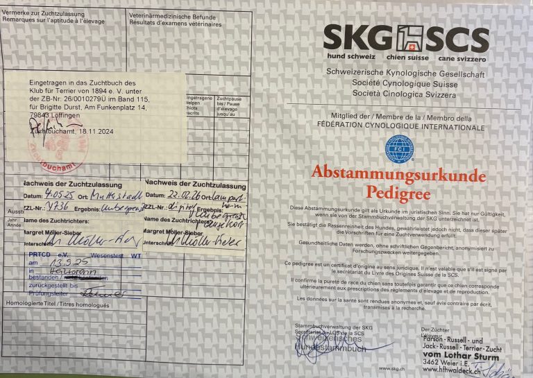 Am 13.09.2025 waren wir zum Wesenstest in Heilbronn beim PRTCD (Parson Russell Terrier Club Deutschland). In diesem Verein sind überwiegend Jäger mit ihren Jagdhunden. Wir wurden sehr freundlich aufgenommen, haben uns sehr wohl gefühlt und durften einen tollen, erfolgreichen Tag mit lauter netten Leuten erleben. Sammy hat sich hervorragend bewährt, u.a. auch Sichtlaut gezeigt und wir konnten mit einem „Bestanden“ wieder nach Hause fahren.